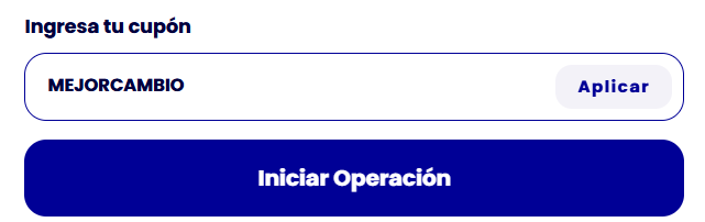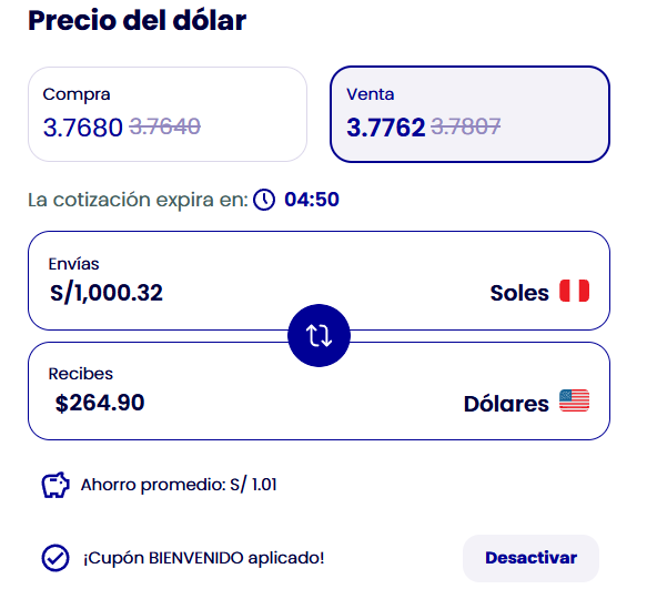 4. Si deseas cambiar de dólares a soles, debes colocar el símbolo de dólares en la parte de arriba, si deseas cambiar de soles a dólares solo debes colocar el símbolo de dólares en la parte inferior. En tu primera operación puedes ingresar el cupón BIENVENIDO para acceder a una mejora en tu tipo de cambio.