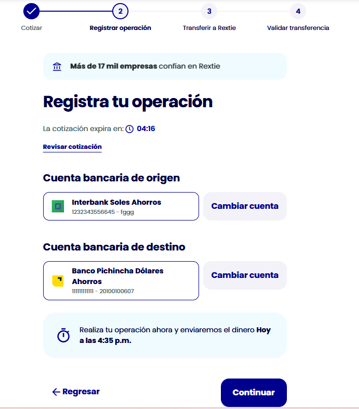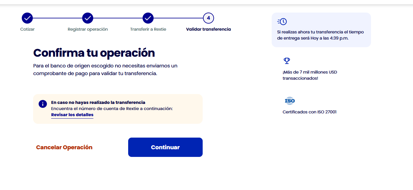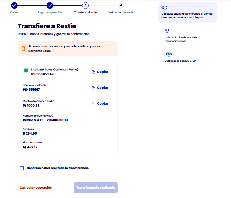6. Por último, realiza una transferencia desde tu banca en línea a la cuenta de Rextie. Puedes confirmar tu operación ingresando el número de operación de la transferencia.